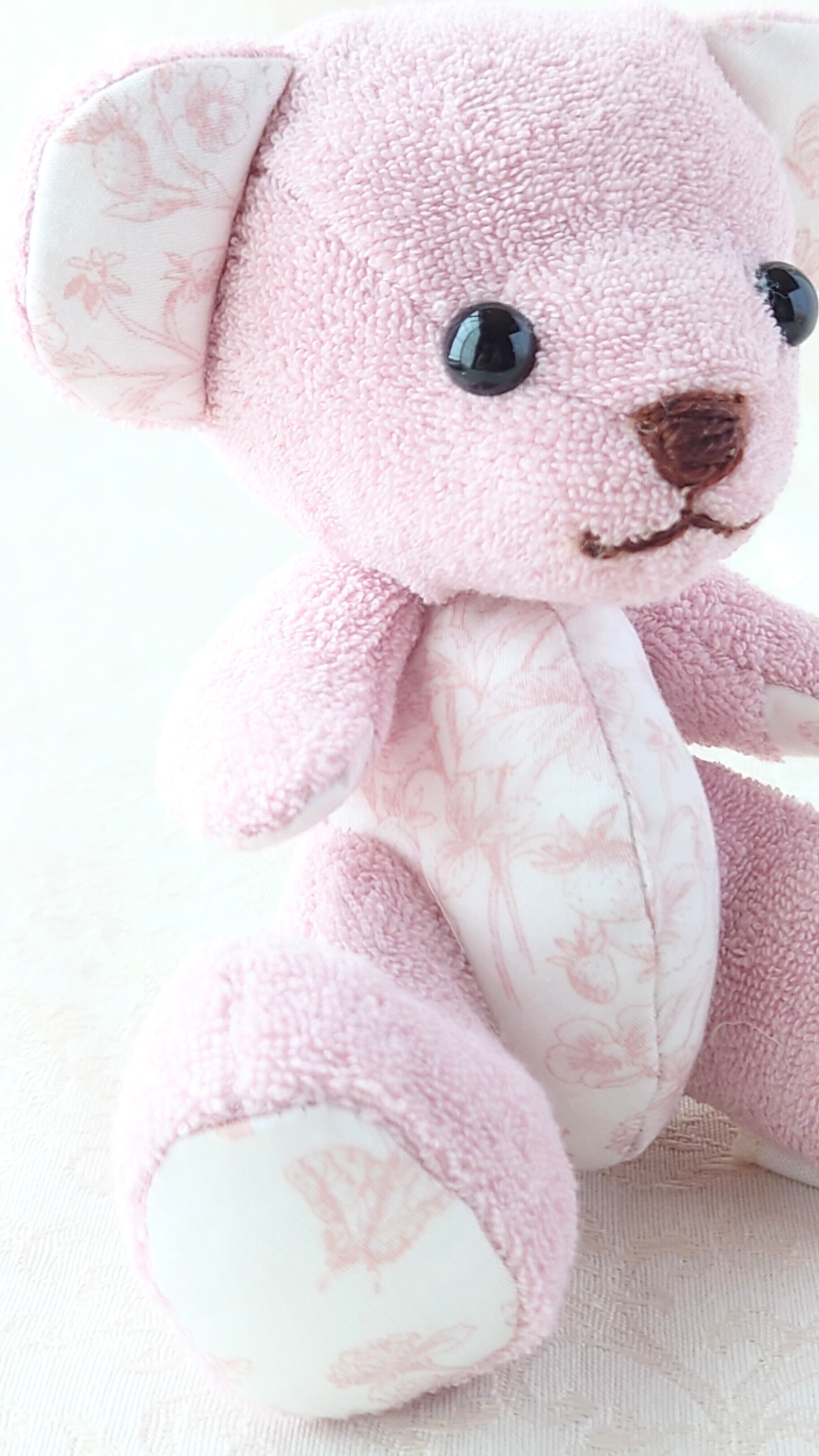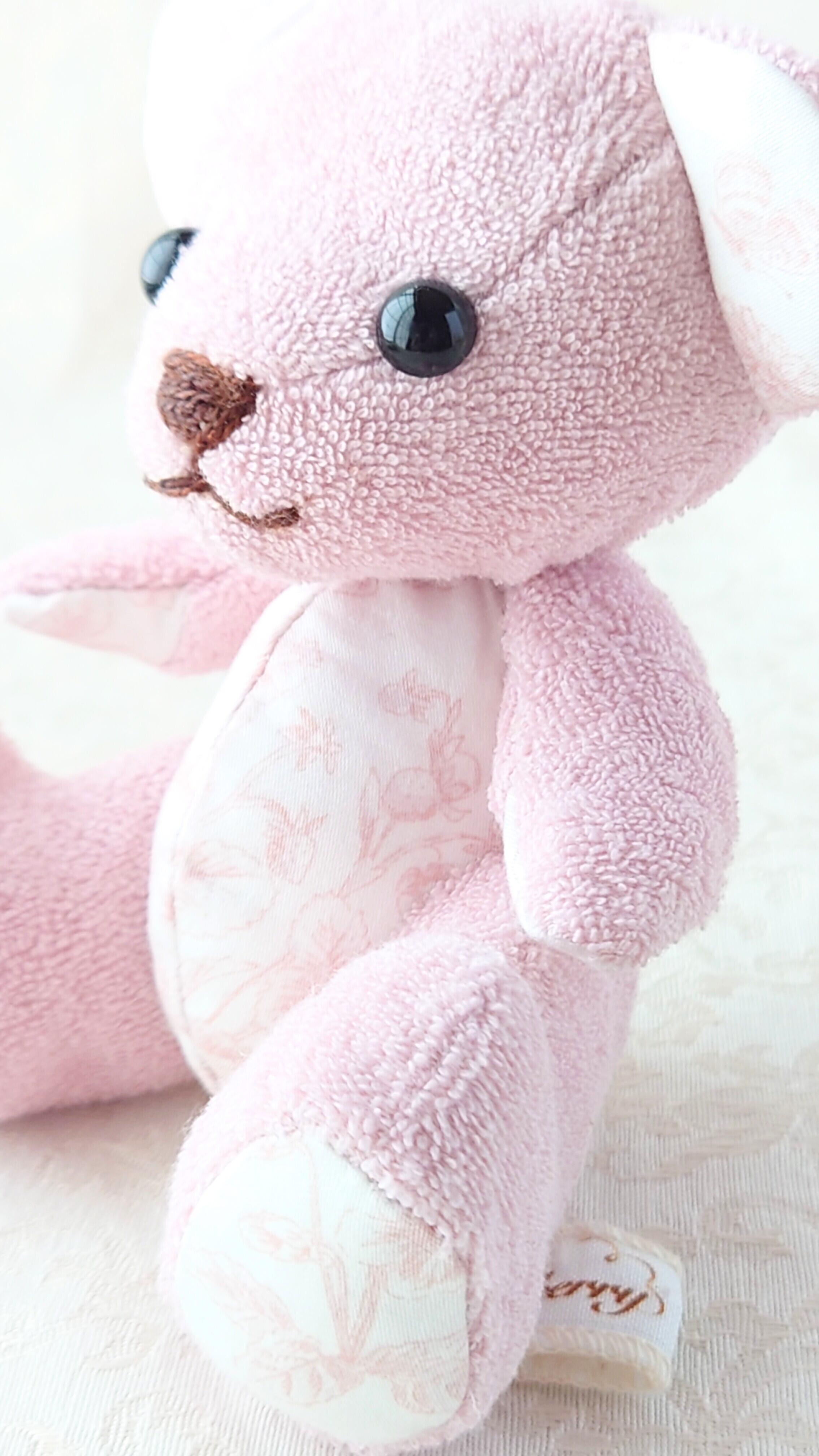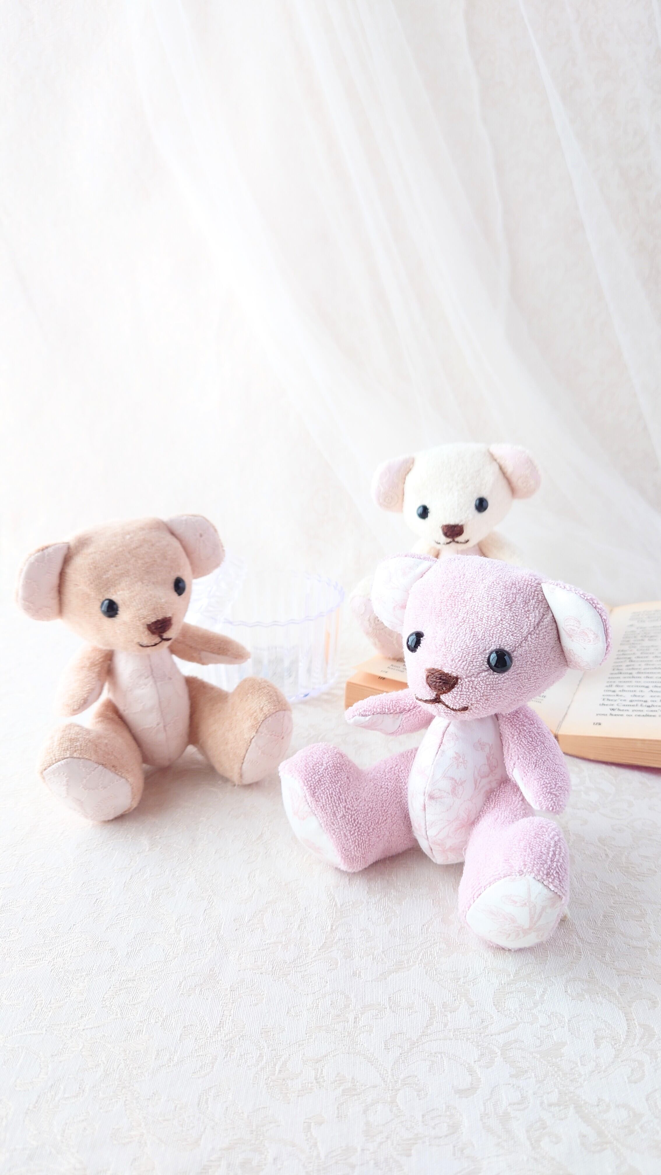 生地・中綿共に綿素材で、お子様も安心して遊べるよう手縫いの箇所や外れやすいパーツを極力減らしたぬいぐるみタイプのテディベアになっています。